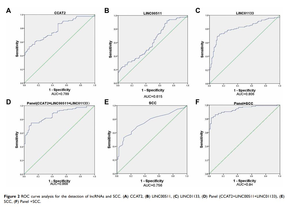 血清 lncRNA (CCAT2,LINC01133,LINC00511) 与鳞状细胞癌抗原组套作为检测宫颈鳞状细胞癌的新型非侵入性生物标记物