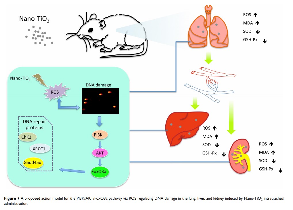 大鼠气管内给药后,TiO2 纳米粒子通过 ROS 激活的 FOXO3a 信号通路在肺和肺外器官中造成 DNA 损伤