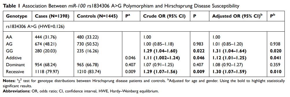miR-100 rs1834306 A> G 增加了华南儿童患先天性巨结肠症的风险