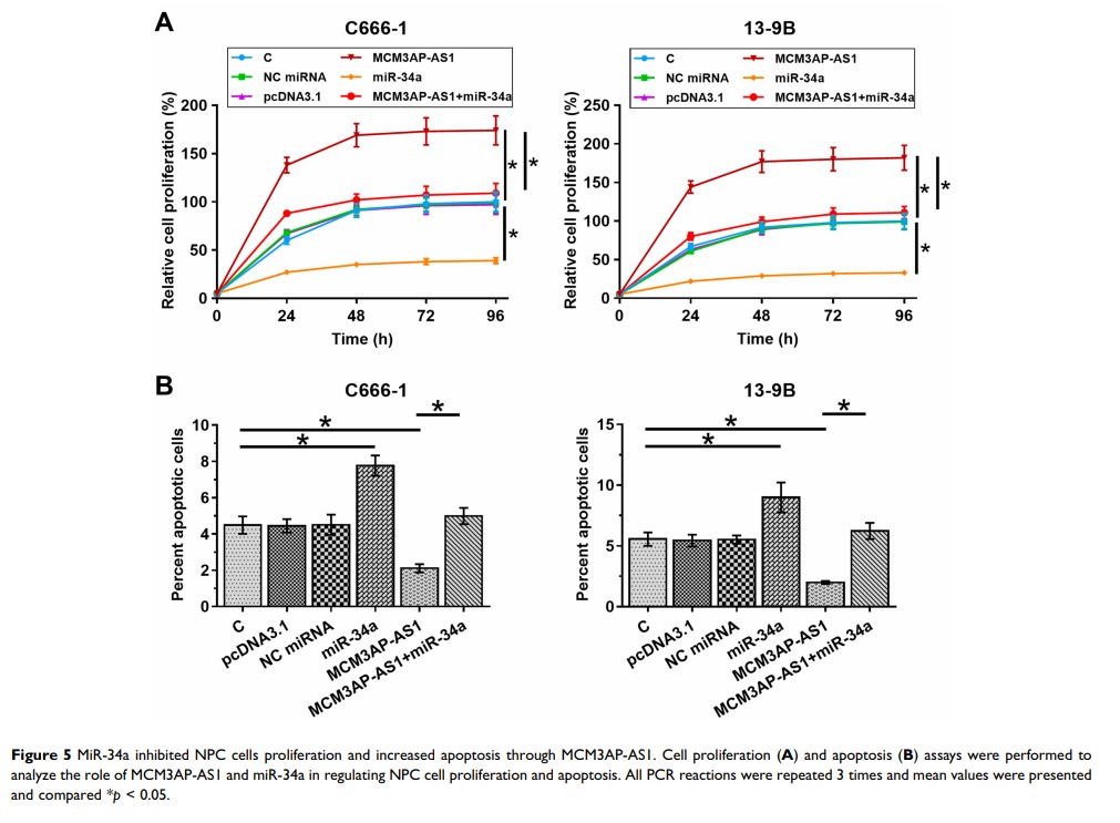 MiR-34a 通过靶向 lncRNA MCM3AP-AS1 抑制人鼻咽癌细胞增殖并诱导细胞凋亡