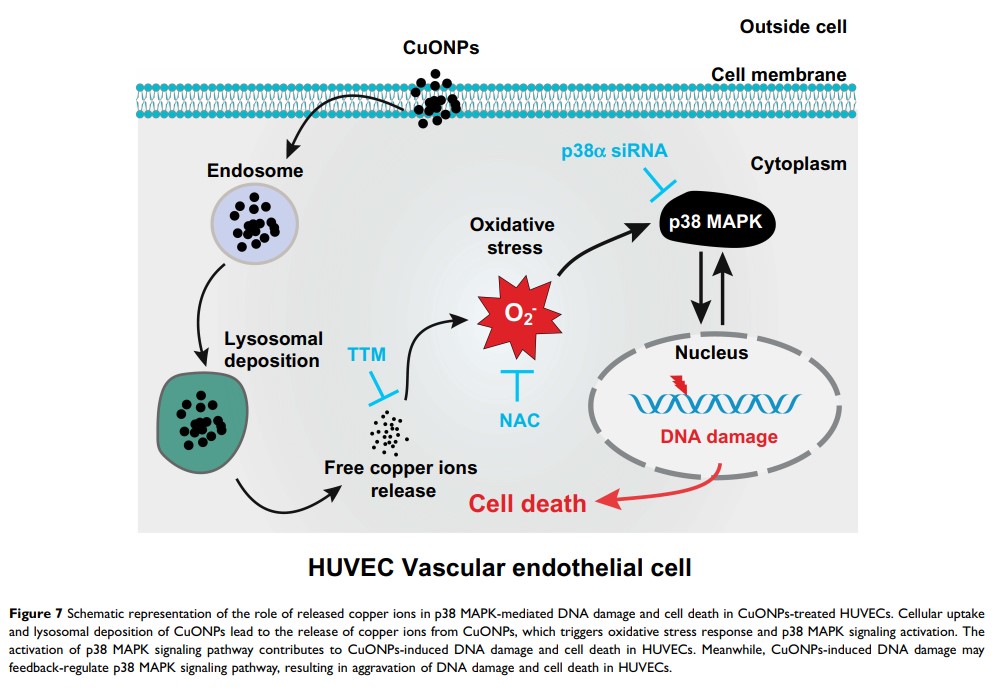 通过铜离子介导的 p38 MAPK 活化,氧化铜纳米粒子可诱导血管内皮细胞氧化性 DNA 损伤和细胞死亡