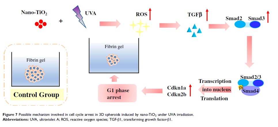 3D 椭球模型中,在 UVA 辐射下并经二氧化钛纳米粒子诱导,TGF-β 和 ROS 参与 G1 细胞周期阻滞