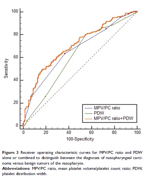 平均血小板体积/血小板计数比和血小板分布宽度的结合使用可用来区分鼻咽癌患者、鼻咽部良性肿瘤患者和健康受试者