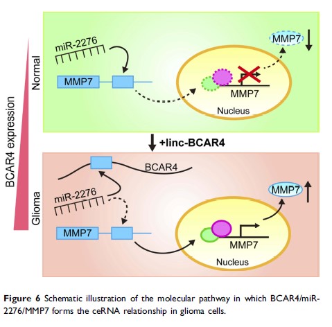 长非编码 RNA BCAR4 通过靶向 miR-2276 来上调胶质瘤中 MMP7 的表达,从而促进生长、侵袭和致瘤性
