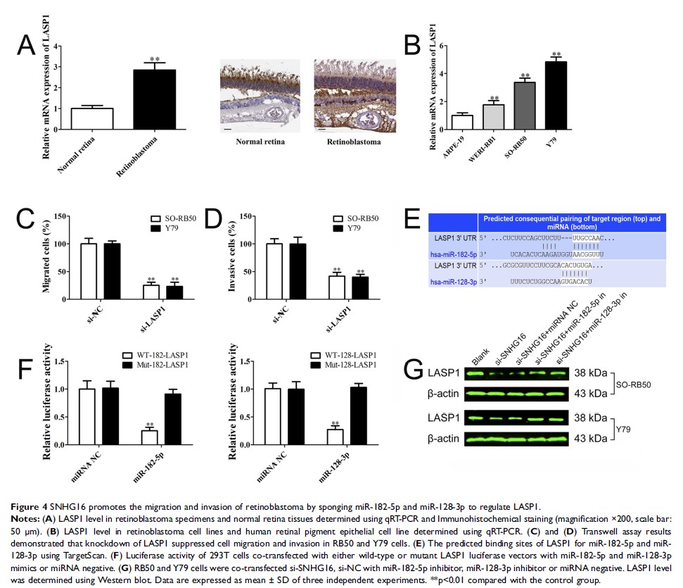 长非编码 RNA SNHG16 使 miR-182-5p 和 miR-128-3p 海绵化,从而通过靶向 LASP1 促进视网膜母细胞瘤细胞迁移和侵袭
