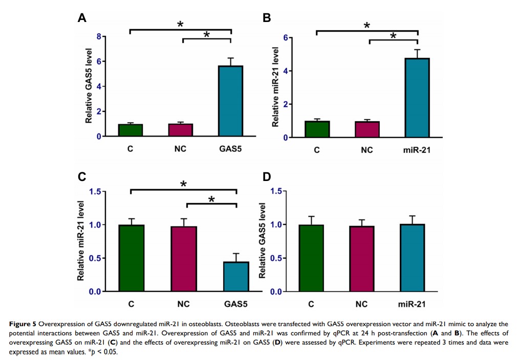在骨质疏松症中 lncRNA GAS5 会上调,而 miR-21 的下调可促进破骨细胞凋亡