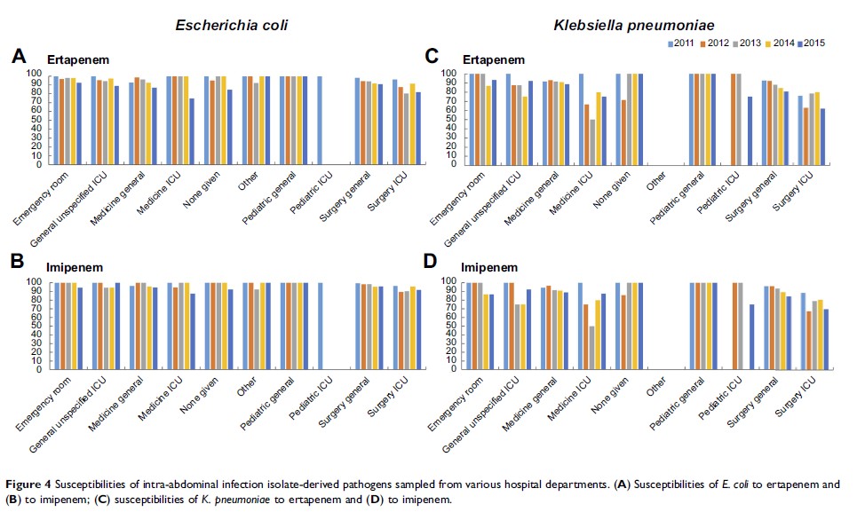2011 年至 2015 年中国腹腔感染者大肠杆菌和分离自腹腔感染者的 肺炎克雷伯菌病原菌的抗菌药物敏感性变化