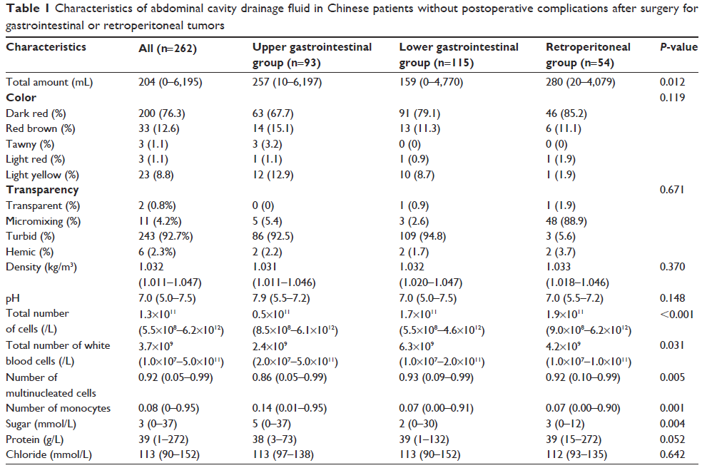 接受胃肠道或腹膜后肿瘤手术后无术后并发症的中国病患的腹腔引流液的特点