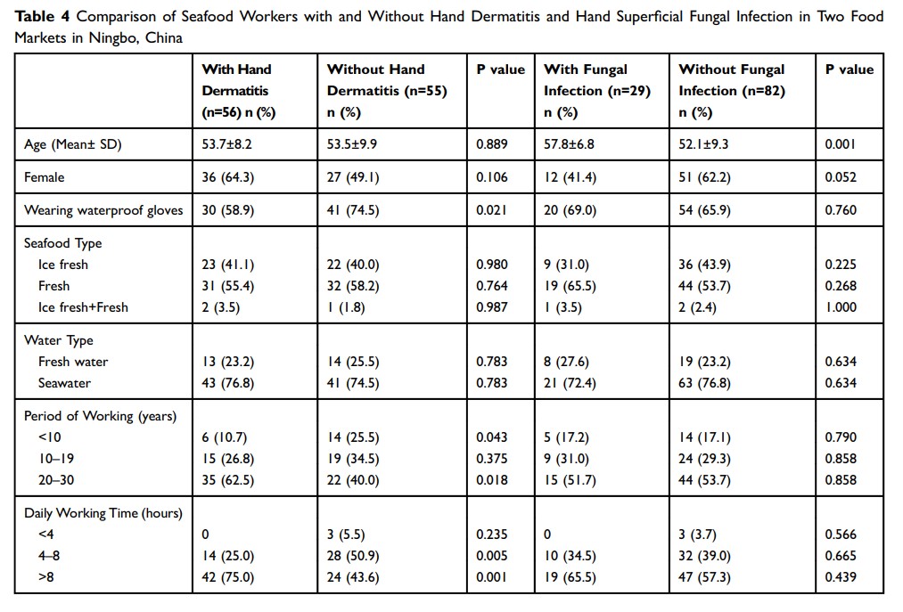 海鲜工人中皮炎和手浅表性真菌感染的患病率:宁波市食品市场调查