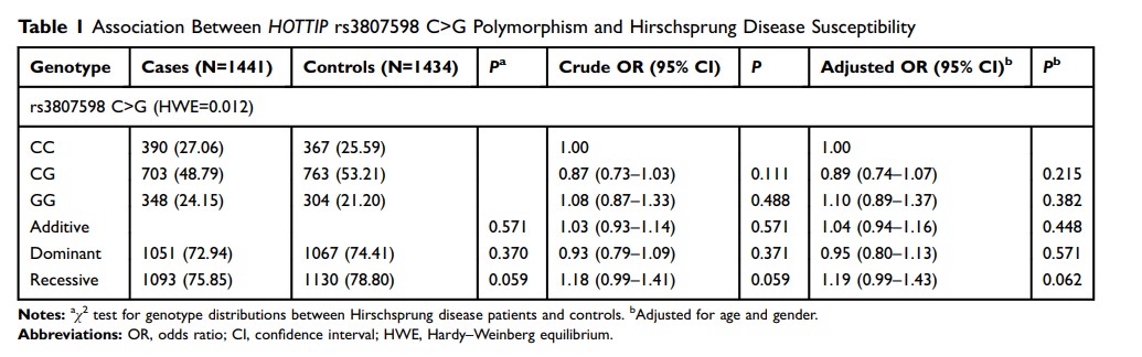 lncRNA HOTTIP rs3807598 C>G 与先天性巨结肠症(希尔施普龙病)呈负相关