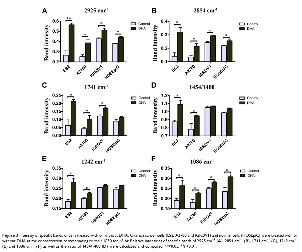 傅立叶变换红外光谱法监测双氢青蒿素诱导下的,卵巢癌细胞和正常的卵巢表面上皮细胞生长的抑制