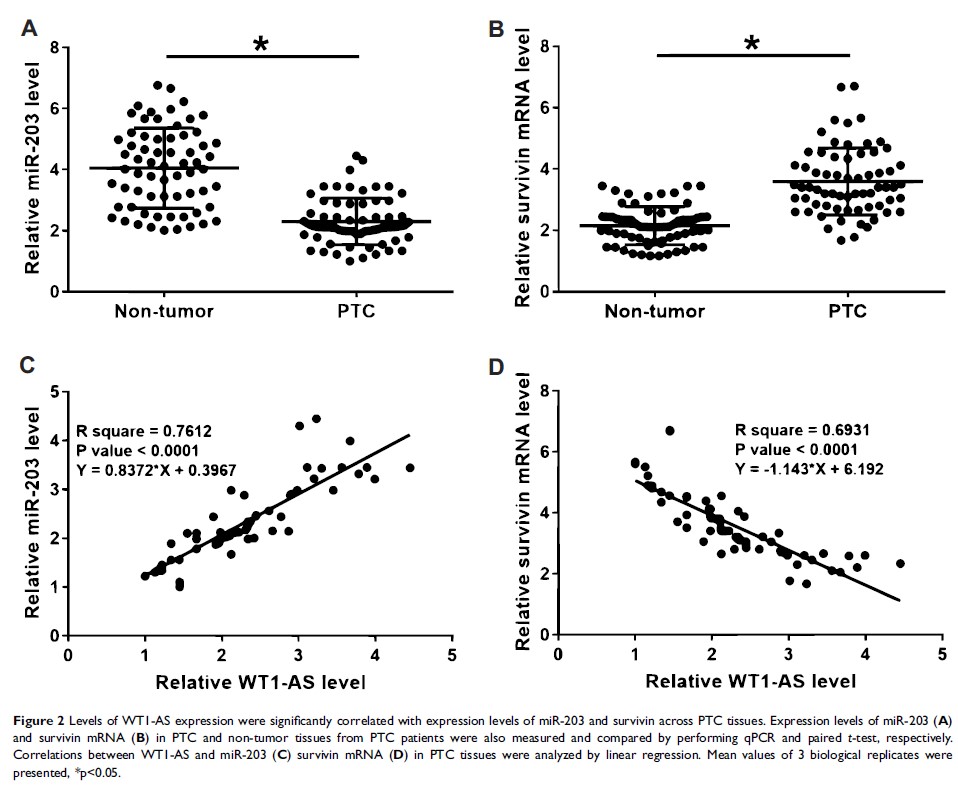 LncRNA WT1-AS 通过在乳头状甲状腺癌中上调 miR-203 使 Survivin 下调