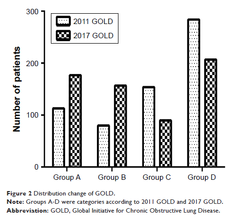 比较中国慢性阻塞性肺疾病患者在 2011 年和 2017 年 GOLD 分组中的临床特征以及综合评估指标方面的差异