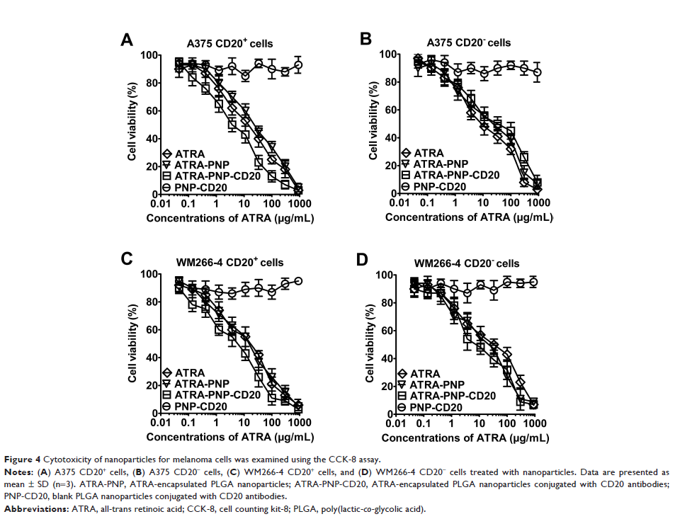 全反式维甲酸包裹、CD20 抗体偶联的聚(乳酸 - 共- 羟基乙酸)纳米粒子有效地靶向并在体外消除黑素瘤起始细胞