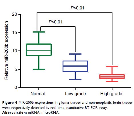 MicroRNA-200b 的表达水平与人脑胶质瘤的病理分级呈负相关
