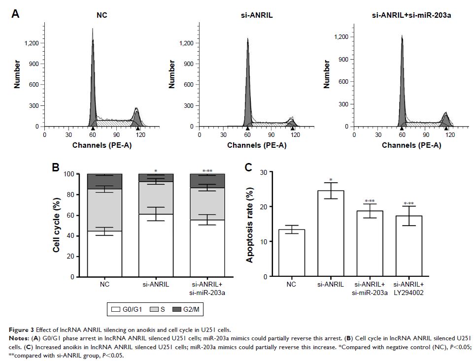 lncRNA ANRIL 沉默对 microRNA-203a 及人脑胶质瘤失巢凋亡及细胞周期的影响