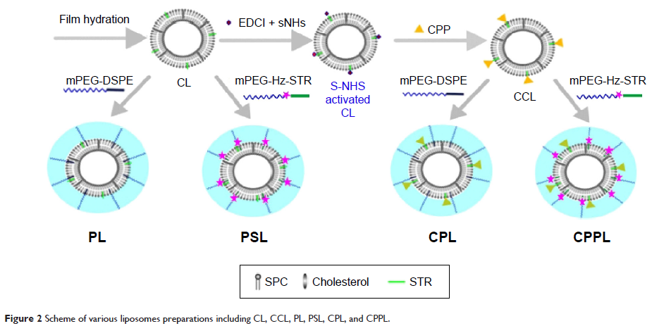 摘要:细胞穿透肽(CPP)作为一种具有细胞穿透,内化和溶酶体逃逸功能的小分子,在药物递送系统中具有潜在的应用前景。然而,缺乏细胞选择性是限制其应用的瓶颈。我们利用聚乙二醇 PEG 的水化层的保护作用和腙键的 pH 敏感性,构建了一种 CPP 修饰的 pH 敏感脂质体(CPPL)来提高 CPP 对肿瘤的特异靶向性:CPP 通过和脂质体上的硬脂酸(STR)直接偶联以避免 PEG 作为连接臂对其功能的阻碍作用,同时我们合成了一种 PEG 衍生物 (PEG2000-Hz-STR, PHS) ,其中 PEG 和 STR 通过酸降解的腙键偶联。HPLC 和流式细胞术(FCM)实验结果表明这种 PEG 衍生物在中性条件下具有良好的稳定性,而在酸性环境中,腙键断裂 PEG 离开脂质体表面使得 CPP 能够完全暴露。本文优化了 CPPL 中 CPP 的修饰密度,保证了其对肿瘤细胞的最大靶向作用而不被正常组织过多的摄取,由此体现出长循环性。在体内外的研究表明,密度为磷脂 4% 摩尔比的 CPP 所修饰的 CPPL 给药系统,体现出较高的靶向亚细胞器的内化效率,同时最大程度地避免了快速从血液中清除。这种 CPPL 给药系统在今后抗肿瘤药物的临床应用具有较大的潜能。