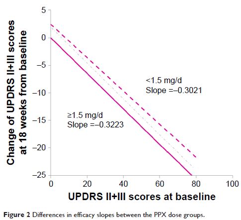 Rating Scale, UPDRS II+III)较基线的变化为主要疗效终点。在该研究中,已证实普拉克索缓释片和速释片均可有效改善早期和晚期患者的症状,疗效和安全性相当。在本次回顾性分析中根据普拉克索维持剂量(<1.5 mg/d 组和 ≥1.5 mg/d 组)、帕金森病病程分期(早期和晚期患者)、基线合并左旋多巴剂量(0-<400mg/d 组和 ≥400 mg/d 组)、和基线时震颤贡献度(震颤评分占 UPDRS II+III 总分的百分比 <20% 和 ≥20%) 来分别进行分组,探索性分析上述变量对疗效的影响。基线 UPDRS II+III 总分作为协变量,用于协方差分析 UPDRSII+III 的评分改善。使用协方差分析来评估每个分组的 UPDRS II+III 分值改善,采用全分析集(FAS),包括所有随机分组,至少接受一次用药,且有基线时和基线后 UPDRS II+III 分值的患者。